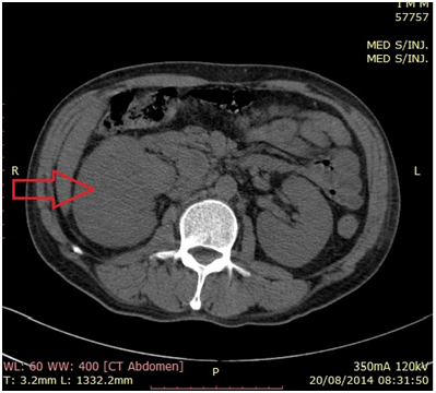 TVES of risk factors are common to those of bladder tumors or smoking is widely incriminated with RR 2 or 3 compared to non-smokers.4 The decoction of plants is the etiologic agent found in our observation and could be the source of our sporadic cases. A risk factor similar to those found in the Balkan nephropathy and Chinese herbs recognized and reported in the literature since 1950.3 The discovery of TVES is happy chance in 10 to 16% of cases depending on the series with the waning of abdominal imaging performed for another reason.5 A pleurisy operating in a context of an impaired general condition us discover renal tumor after scannographic etiologic. Our case is a circumstance of discovery rarely reported in the literature and demonstrates advanced or metastatic TVES.6 Other more specific functional signs are indicative of these tumors such as hematuria (68-82%), pain (20-30%) or lumbar mass (10%).3 According to the recommendation of the AFU and the UAE (grade C), the USSR (flexible ureterorenoscopy) allows both to make the diagnosis (biopsy, cytology in situ) and conservative treatment of TVES in a time.7 Morphologically, the uro-scanner potentiated by furosemide injection is the reference imaging modality with a sensitivity and specificity of around 96% and 99% as against 50 to 60.5% for IVU.8 MRI can replace the uro-scanner but is not realized as first-line diagnosis or staging as if our observation.8