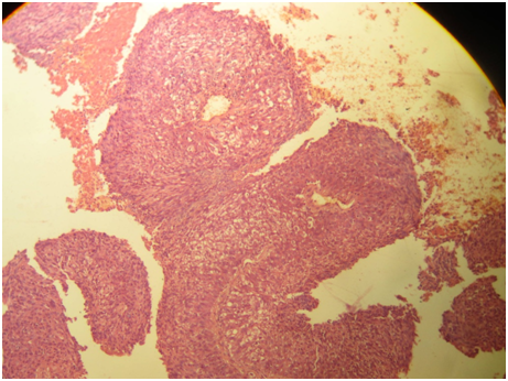 The TVES entities are rare and account for about 5% of urothelial carcinomas all reported worldwide.3 The incidence of TVES peak between 70 and 80 years with an average age of diagnosis is between 65-70 years.3 The young age of discovery in our case is explained by the youth of our population. They most commonly affect men with a sex ratio of 1.5 to 2, 8en Europe and the United State between the period of 1997 to 2010.3,4 Our observation is the first case reported in Madagascar and no similar study is found in the Malagasy literature where the incidence of TVES unknown in our country.