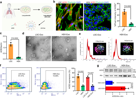 f. Demonstrating quantification of ACE-2 expression on LSC-Exo and HEK-Exo by flow cytometry. n=3.7.