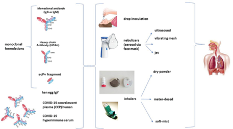 Figure 2 Demonstrating potential therapeutic approaches for respiratory delivery of passive immunotherapeutics against SARS-CoV-2 (COVID-19).8