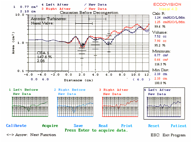 The World Allergy Organization recognized acoustic rhinometry as a protocol, monitoring, control measure in Nasal Provocation Tests (NPTs) which are used as an indicator in confirming clinically relevant allergy and in the diagnosis of allergic rhinitis.15 According to the published dP NPT protocol, it showed to have good specificity and sensitivity to discriminate patients with allergic rhinitis from controls monitored by Acoustic Rhinometry (AR) and nasal symptom score in children and adolescents.11,15 Specific measurements that are performed before and after the application of a nasal decongestant spray, such as in the case of allergic rhinitis, the differences in cross-sectional diameter of the nose can be attributed to nasal mucosal congestion. Data obtained after nasal decongestion allow the evaluation of anatomical factors influencing the cross-sectional diameter of the nose with the use of Acoustic Rhinometry.15 These findings were presented at the American Academy of Allergy, Asthma, Immunology, February 2015.