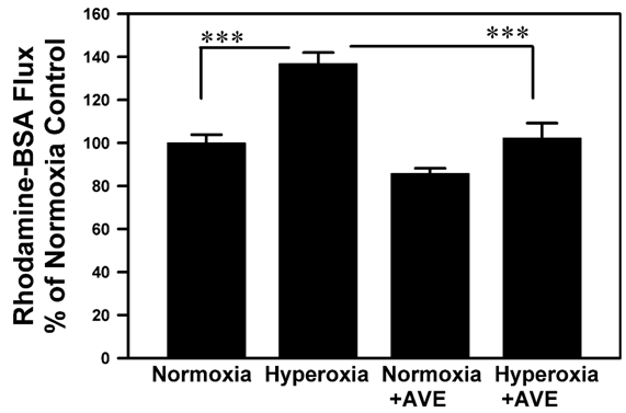 Figure 1 shows a significant increase in albumin flux through A549 cell monolayers cultured on Transwell inserts that had been exposed to 95%O2 or normoxia (21% O2). The increase in albumin flux was significantly decreased in the presence of the Mas activator AVE0991.