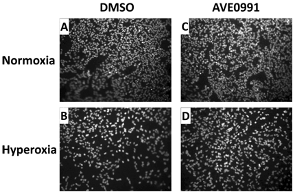 Figure 2 shows that 72 hours exposure to hyperoxia reduces the cell number in A549 cell monolayers cultured on Transwell polycarbonate inserts, Moreover, AVE-0991 prevents the loss of cell number (compare Panel D to Panel B).