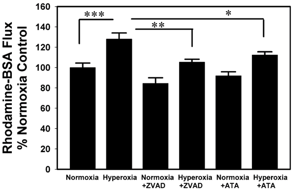 In Figure 3, the pan-caspase inhibitor ZVAD-fmk or the endonuclease inhibitor aurintricarboxylic acid (ATA) prevented the hyperoxia-induced increase in Rhodamine-BSA flux through cultured A549 cell monolayers.