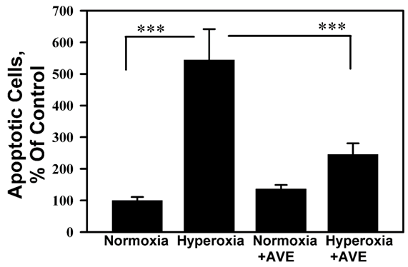 Figure 4 shows that AVE-0991 prevented the induction of nuclear fragmentation, the final stage of apoptosis, in A549 cell monolayers exposed to hyperoxic gas.