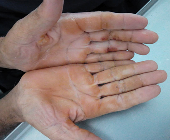 Figure 1 Fissural and erythematous hyperkeratosis of the palmar face of the hands (mechanic's hands).