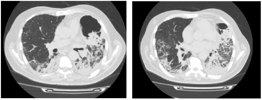 Thus, we checked specific markers for connective tissue diseases. Laboratory immunological tests revealed increased anti–nuclear antigen antibodies, as well as positive anti–extractable nuclear antigen (anti–Jo–1 antibodies positive and anti–SSA–Ro52 positive); rheumatoid factor and anti–neutrophil cytoplasmic antibodies (C–ANCA and P–ANCA) were at normal values. Bronchoalveolar lavage was not performed initially. The diagnosis of Antisynthetase syndrom was made, and the patient continued prednisone at the dose of 60mg/day (1mg/kg). Cyclophosphamide pulse therapy (750mg. once every 45 days × 6) was programmed.