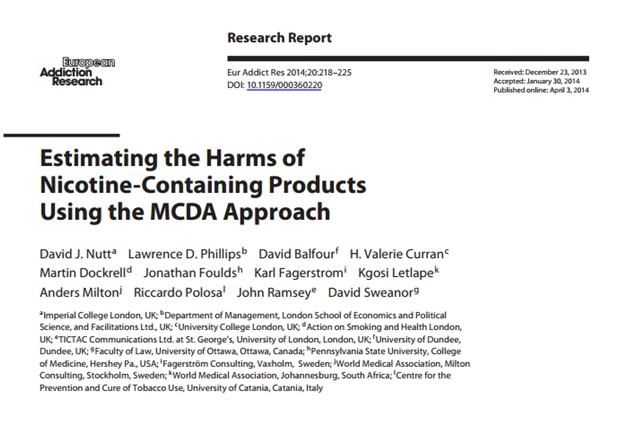 Twelve experts in tobacco were given the task of scoring 12 different nicotine containing products using a multi-criteria decisional analysis (MCDA); which was created to estimate the harm of psychoactive drugs to both the individual and to society. The products were scored under 14 different criteria: 7 were "harm to the user" and 7 were "harm to others". Traditional cigarettes were given a value of approximately 100% and the rest of the nicotine containing products were judged against this. Below is a graph showing the analysis of how electronic cigarettes (ENDS) are deemed to be 95% less harmful than cigarettes (a relative score of 5% harm).