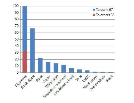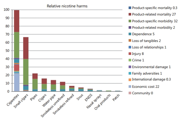 The graph shows that only cigarettes were given any scoring in "harm to others". Just looking at "harm to users", we now see that small cigars and cigarettes are given about the same score of 67%. If we remove the scoring of "harm to others" from cigarettes and now compare that to ENDS (e-cigarettes), the "harm to user" now increases by threefold to about 15% instead of 5%.