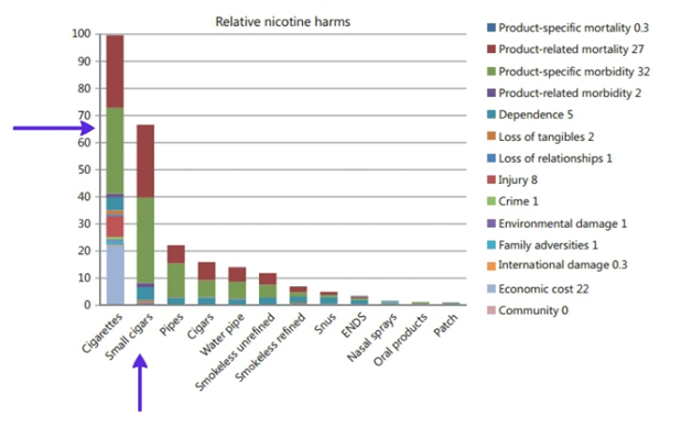 From this graph you could also conclude that small cigars (second item from the left) are about 35% less harmful than traditional cigarettes also (scoring about 65% relative harm compared to traditional cigarettes).