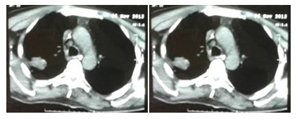 Fifty two year old Iraqi national presented with altered sensorium. He had 25 pack years of smoking history but without any symptoms or treatment related to chronic obstructive pulmonary disease. There was no other medical or surgical history as well. Physical examination revealed normal vital signs. Abdomen, cardiovascular and respiratory system were unremarkable. On neurological assessment he qualified Glassgow Coma Scale of 12/15. However there was no focal neurological deficit. Haemogram, liver and kidney biochemistries were acceptable. Computerised tomography (CT) of head did not reveal any abnormality. Lumbar puncture for cerebrospinal fluid (CSF) examination was performed. It revealed high pressure with mononuclear pleocytosis, high protein and below normal sugar. India ink preparation, smear for acid fast bacilli and gram stain were unyielding. Cytology revealed fair number atypical cells singly and in clusters, larger in size with high nucleo-cytoplasmic ratio, coarse chromatin and scanty to moderate cytoplasm with few binucleate forms. Features highly suggestive of metastasis. This lead to search for primary site of malignancy. Chest skiagram (Figure 1) of the patient showed rounded opacity in right upper zone of lung. Contrast enhanced CT scan of chest was requested and it unvield speculated mass lesion in the upper lobe of right lung (Figure 2). Videobronchoscopy examination revealed abnormal findings in the right upper lobe. Mucosa appeared swollen with rough surface but without any endobronchial growth. Rest of the bronchial tree was normal. Bronchial washings, endobronchial and transbronchial biopsies were obtained from the right upper lobe. Histopathology of biopsy was positive for non small cell carcinoma of the lung subtype adenocarcinoma (Figure 3).