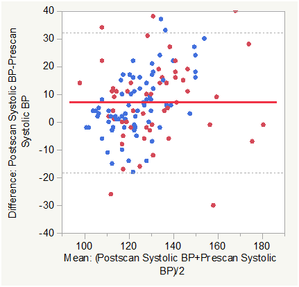 Matched pair analysis was accomplished for systolic blood pressure Post-Pre scan and Screening-Prescan. The Mean difference Post-Prescan was 6.95 mmHg (N=127, Correlation = 0.7236, prob >|t| = 0.0001 uncorrected, 0.0012 Bonferroni corrected). The Mean difference Screening-Prescan was 0.9212 mmHg (N=127, Correlation = 0.5725, prob >|t| = 0.4685 uncorrected, 1.0 Bonferroni corrected). Mean systolic blood pressure was slightly higher post scan than prescan consistent with minimum impact of the effort of multiple breath holds. There was no significant difference between screening and prescan systolic BP.