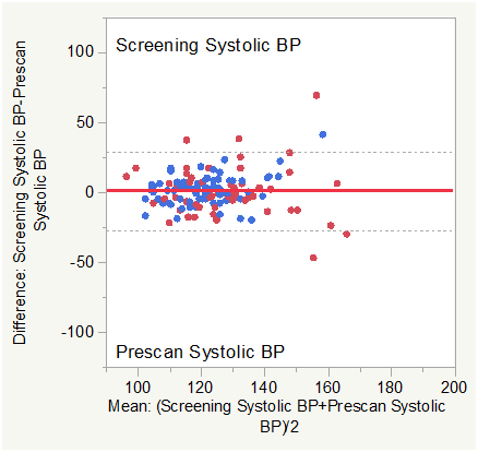 Bland Altman Analysis and matched pair analysis of the cardio-respiratory markers were analyzed using the methods comparison accuracy add-in (JMP Pro, V14, SAS, Cary, NC) for the screening, pre and post imaging measurements where the pre-imaging values were selected as the reference measurement.