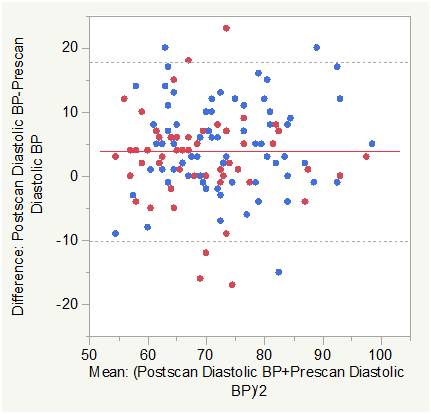 Matched pair analysis was accomplished for diastolic blood pressure Post-Pre scan and Screening-Prescan. The Mean difference Post-Prescan was 3.866 mmHg (N=127, Correlation = 0.7657, prob >|t| = 0.0001 uncorrected, 0.0012 Bonferroni corrected). The Mean difference Screening-Prescan was 1.614 mmHg (N=127, Correlation = 0.6696, prob >|t| = 0.035 uncorrected, 0.42 Bonferroni corrected). Mean diastolic blood pressure was slightly higher post scan than prescan consistent with minimum impact of the effort of multiple breath holds. There was no significant difference (corrected) between screening and prescan diastolic BP.