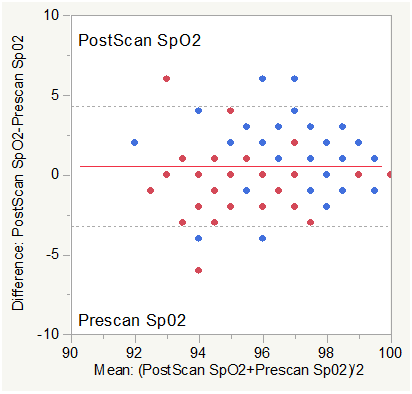 Matched pair analysis was accomplished for SpO2 Post-Pre scan and Screening-Prescan. The Mean difference Post-Prescan was 0.559% (N=127, Correlation = 0.599, prob >|t| = 0.0013 uncorrected, 0.0156 Bonferroni corrected). The Mean difference Screening-Prescan was -0.197% (N=127, Correlation = 0.644, prob >|t| = 0.2332 uncorrected, 1.0 Bonferroni corrected). Mean SpO2 was slightly higher post scan than prescan consistent with minimum impact of the effort of multiple breath holds. There was no significant difference (corrected) between screening and prescan SpO2.