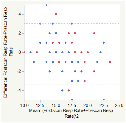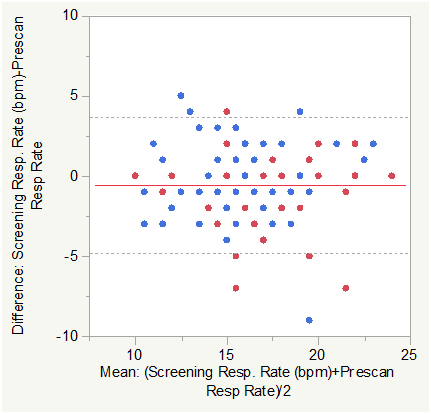 Figure 5B Bland Altman Plot for Respiratory Rate in breaths per minute (Screening vs. Pre-Scan).