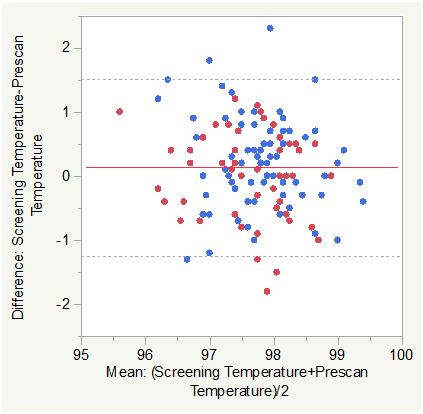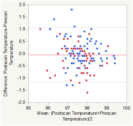 Matched pair analysis was accomplished for Temperature Post-Pre scan and Screening-Prescan. The Mean difference Post-Prescan was -0.0465 °F (N=127, Correlation = 0.725, prob >|t| = 0.3594 uncorrected, 1.0 Bonferroni corrected). The Mean difference Screening-Prescan was 0.133 °F (N=127, Correlation = 0.5817, prob >|t| = 0.0345 uncorrected, 0.414 Bonferroni corrected). Mean Temperature was marginally lower post scan than prescan and not significant either statistically or physiologically. There was a small difference between screening and prescan Temperature that was not significant (corrected).