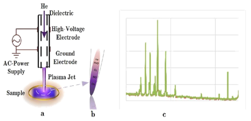 Figure 1 a) Schematic of the Plasma Jet have been used in this experiment b) Tip of the jet c) plasma spectra.