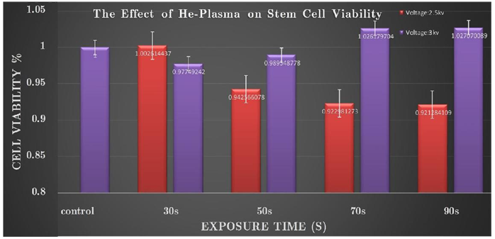 The metabolic activity, or cell viability is shown in Figure 8, as can be seen when the voltage of plasma generator is 3kV, the cells grow faster, dose dependently (here, the duration of plasma exposure is considered as plasma dose).