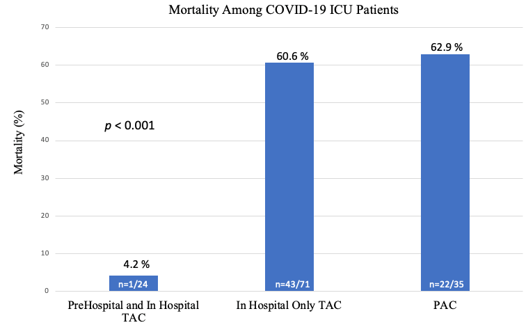 Results: 130 patients were included in the study, 95 of whom received TAC and 35 PAC. There was 50.8% overall mortality, with lower mortality in the TAC vs PAC group (46.3% vs 62.9%, p=0.094). There were few thromboembolic and hemorrhagic complications, with no significant difference between TAC and PAC patients. Of 24 patients anticoagulated prior to and during hospitalization, only 1 (4.2%) died, whereas the mortality was 60.6% among patients therapeutically anticoagulated during hospitalization only (p<0.001). Multivariable analysis revealed patients who received prehospital and in hospital TAC had a 92% lower risk of death (p=0.008) compared to in hospital only TAC and PAC patients.