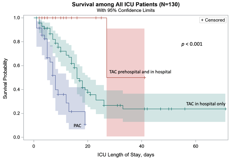 The distributions of baseline characteristics, vital signs, laboratory results, treatments, and outcomes were computed for the entire study population, for patients who received TAC (all TAC patients, prehospital and in hospital TAC patients, and in hospital only TAC patients), and for patients who received PAC. Frequency and percentages are reported for categorical variables, and median and interquartile range (IQR) are reported for continuous variables. Since nearly all were determined to be non-normally distributed according to the Shapiro-Wilk statistic. Bivariate comparisons of categorical and continuous variables were tested using Pearson’s chi-square statistic (or Fisher’s exact test when warranted by small cell counts) or two-sided Wilcoxon Rank-Sum statistics, respectively. Adjusted relative risks were computed using multivariable modified (robust variance estimator) Poisson regression models. Survival curves were estimated using the Kaplan-Meier method. All analyses were performed using SAS version 9.4 (SAS Institute, Cary, NC). A p-value of <0.05 was considered statistically significant.