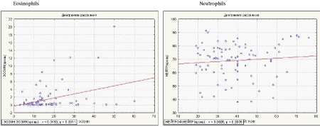 Figure 2 shows the results of comparing the percentage composition of eosinophils and neutrophils in the sputum and in the peripheral blood of the study subjects, without separating them into clinical groups.