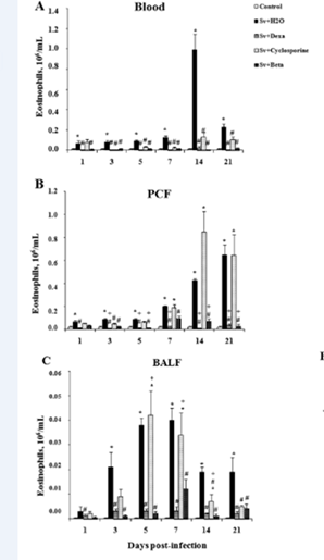 Citation: Machado ER, Ueta MT, Rodrigues RM, et al. Effects of dexamethasone, cyclosporine and betamethasone on inflammatory cell recruitment in mice infected with Strongyloides venezuelensis. J Lung Pulm Respir Res. 2019;6(4):108-114. DOI: 10.15406/jlprr.2019.06.00219