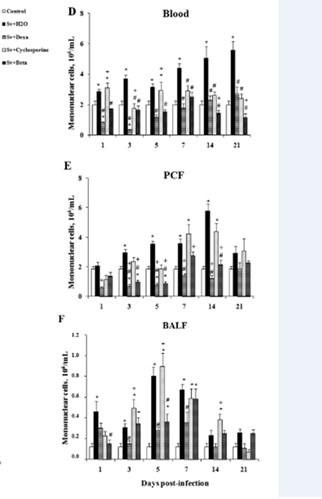 Effects of Dexamethasone, Cyclosporine, and Betamethasone on the inflammatory leucocyte influx in the peritoneal cavity and BALF Infective larvae of S. venezuelensis induced in mice increased the infiltrate of total leucocytes (Figure 2B), eosinophils (Figure 4B) and mononuclear cells (Figure 4E) in the peritoneal cavity, when compared with the control mice, for all days analyzed. Quantitative variation was observed in the total leucocyte numbers, eosinophils and mononuclear cells during the infection. The migration of inflammatory cells to the peritoneal cavity was time-dependent. The peak in the total leucocytes (Figure 2B) and mononuclear cells (Figure 4E) were observed on the fourteenth day and in eosinophils (Figure 4B).on the twenty-first day post-infection in mice infected and untreated The Dexa and Beta treatments of infected mice were associated with an inhibition in the recruitment of total leucocytes, eosinophils and mononuclear cells in all periods when compared with mice of the infected and untreated group. These cell numbers were similar or lower than those detected in the control mice during the infection and treatment (Figure 2B, 4B&E). It appeared that the CsA treatment caused a decline in recruitment of the total leucocytes, eosinophils and mononuclear cells to peritoneal cavity, when compared with the infected and untreated mice. Still, the values observed in these cells were significantly higher when compared with the control group.