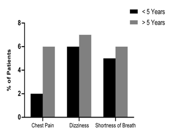 The most prevalent symptoms of workers were shortness of breath, dizziness and chest pain. Workers with less than 5years showed symptoms as follow: 10%, 30% and 25%; while the workers with more than 5years: 30%, 35% and 30% (Figure 1).