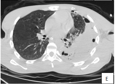 Figure 1 A.B(axial); C(Sag):CT scan shows a left hydropneumothorax, and collapse of the left lung, contralateral shift of the mediastinal contents under tension and left anterior diaphragmatic rupture (B.arrow)with herniated perforated colon(C.arrow), D: (arrow)The nasogastric tube lying just below the cardia (stomach is not involved in the hernia) E: CT in a lung window shows air next to herniated perforated colon.
