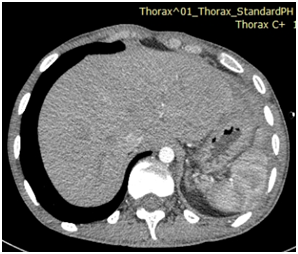 The 28-year-old male presented to the emergency with complaints of dyspnea at rest, pain in the left upper abdomen and vomiting. His past medical history was free except that he was attacked by a knife in the left hypochondrium about a year ago causing a superficial injury sutured at the emergency. He denied any systemic diseases, recent history of surgical procedures.