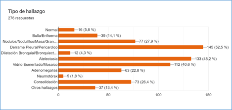 It is relevant to highlight that in 98% of the studies, pathological findings of various kinds were found, which supports the indication of CT Angio in these patients. Among the most common are pleural or pericardial effusion, atelectasis, and the ground glass or mosaic pattern.