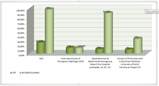 The results obtained in this study were compared with 3 multicenter studies of previous research, reaffirming the relevance of carefully evaluating incidental findings during the interpretation of CT angiography for the diagnosis of PE. In such studies, it is worth highlighting the important difference that in the hospitals evaluated, all have an emergency service, so the patient rate is higher; on the other hand, the diagnosis of PE drops abruptly compared to our research Figure 2.