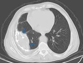 A 96-year-old male patient presented at the outpatient clinic with dyspnea. There was no accompanying cough and sputum. There were no occurrences of night sweats or weight loss. The patient was a rural resident who worked as an animal husbandry professional. An assessment of the patient's medical records revealed that approximately 65 years ago, he was diagnosed with pulmonary tuberculosis.