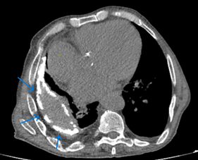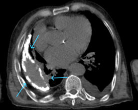 Figure 1 Mediastinal window of March 2010 thorax CT showing a calcified pleural empyema, first CT in the patient's medical history.