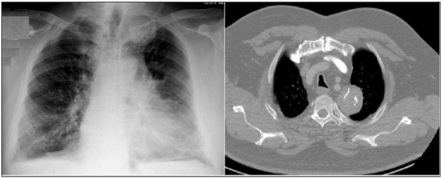 Case 2: A 67-year-old male patient receiving long-term, regular treatment due to chronic obstructive pulmonary disease (COPD) was admitted to our clinic with complaints of shortness of breath for 1wk, phlegm, and sweating. He had a smoking history of 20packs/yr. A coronary artery bypass graft had been performed in 2005 and a left anterior descending coronary artery stent implanted in 2007. Although a mass was detected in the left lung and surgery had been recommended, he had not consented to surgery.