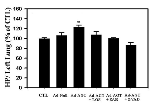 Administration of Ad-AGT at 108 pfu per mouse caused significant collagen accumulation in the lungs at day 14 showed by HP assay, compared with control and Ad-null treated group. Results were shown as µg hydroxyproline (HP) per left lungs (Bars are the mean SEM of at least 3 animals; *, p<0.01). Caspases inhibitor ZVAD, AT1 antagonist Losartan, and non-selective ANGII receptor antagonist Saralasin blocked collagen accumulation in the lungs caused by overexpression of AGT.
