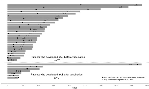 The lot demonstrates the total observation period (d) from the initiating date of the immune checkpoint inhibitors (ICIs) treatment regimen to the end-observation date. The two-doses-of-mRNA-vaccine-against-SARS-CoV-2 (COVID-19) dates are indicated by triangles, and the date of onset of an iaAE(irAE) is indicated by a dot for each of the 26 patients who developed an iaAE(irAE) before vaccination and the seven patients who developed an iaAE(irAE) after vaccination.1