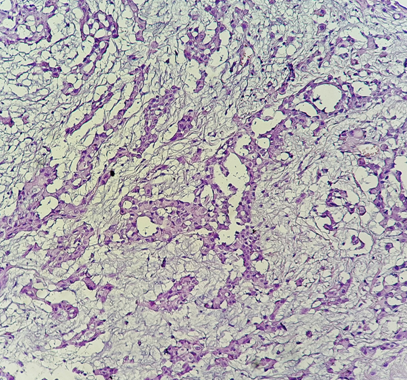 Figure 1 Histological study: HES*200: Carcinomatous proliferation arranged in spans and tubes (pathology department of CHU Hassan II in Fez).