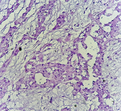 Figure 2 Histological study: HES*400: the tumor cells are large in size with large nuclei. (Pathology department of CHU Hassan II of Fez).