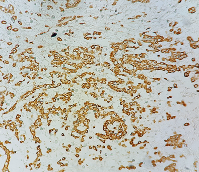 Figure 3 Immunohistochemical study: Diffuse labeling of tumor cells by anti-calretinin antibody (pathology department of CHU Hassan II in Fez).a