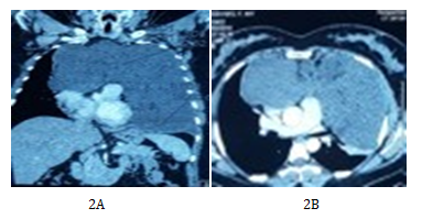 Figure 2 Anterior mediastinal mass with heterogeneous tissue density image with exothoracic component without signs of parietal invasion. This mass is compressing the heart chambers and repressed supra-cardiac vessels without invasion.