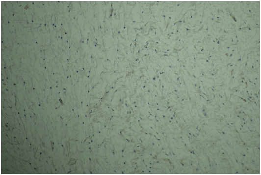 A woman aged 48, with no notable medical history was referred to our medical service for atypical chest pain and experiencing dyspnea, Sadoul stage II, for 3 months. The clinical examination revealed a patient in good condition with a left pulmonary consolidation on chest x-ray (CXR). The dermatological examination was unremarkable. Chest radiography showed an opacity occupying the lower half of the left hemi thorax extending to right para-cardiac area (Figure 1). Chest CT (Figures 2A & 2B) showed an anterior mediastinalmass with a heterogeneous tissue density image with an exothoracic component, without signs of parietal invasion. This mass was compressing the heart chambers and supra-cardiac vessels without invasion. Laboratory tests included the assay of alpha-fetoprotein and beta HCG and were both negative. An earlier mediastinotomy exploration was performed. The exploration revealed an encapsulated tumor/tissue component with gelatinous appearance that suggested a huge bronchogenic cyst. The indication for surgical resection had been opted without carrying out a prior biopsy. Thoracotomy through the anterolateral left 4th intercostal space was performed. The exploration revealed an encapsulated anterior mediastinal tumor with an exothoracic component creeping into the 2nd left intercostal space without parietal or mediastinal invasion. Complete tumor resection including the exothoracic component was performed. Pathological examination (Figures 3–5) of the tumor tissue undertaken by two different laboratories confirmed the diagnosis of benign myxoid mediastinal neurofibroma. The postoperative course was uneventful, the patient was discharged post-operatively on day 5.