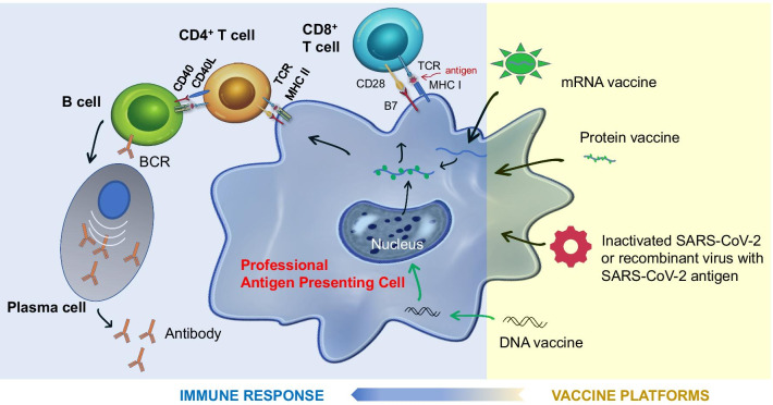 Figure 1 Different platforms of COVID-19 vaccines and mechanisms of antigen presentation, and protective immunity generation.