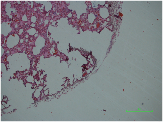 The histological examination of the lungs using the H&E stain revealed diffuse terminal arteriole and alveolar capillary thrombosis (Figure 1), emphysematous and atelectatic changes, destruction of alveolar walls, and rupture of sub pleural alveolar walls (Figure 2). There was very scant inflammation within alveolar walls. The heart, brain, and kidneys, showed multiple thrombi within the microvasculature.