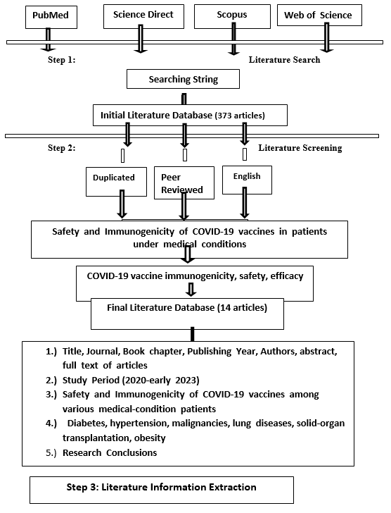 With strict literature search and screening processes, it yielded 14 articles (Table 1) from 373 articles of initial literature database. Needed article information was extracted from each article by : 1) direct information including journal, title, authors, abstract, full text documents of candidate studies, publishing year; 2) place name of the study area; 3) study period; 4) research method used; 5) type of variables studied; 6) types of SARS-CoV-2 (COVID-19)-immunogenicity- and-safety-efficacy-related medical conditions or diseases or disorders studied; and 7) the conclusions made about the impacts of SARS-CoV-2 (COVID-19)-immunogenicity-and-safety-efficacy-related medical conditions or medical diseases or medical disorders on human health.