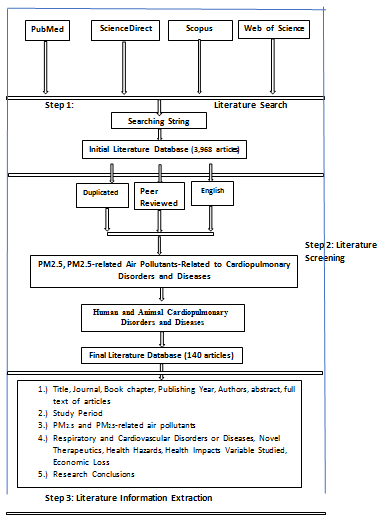 A comprehensive search was carried out in mainstream bibliographic databases or Medical Subject Headings, including ScienDirect, PubMed, Scopus, and ISI Web of Science. The search was applied to the articles that were published between 2017 and early 2019. Our first involved performing searches of article abstract/keywords/title using strings of [(“PM2.5” or “particulate matter 2.5”, “ PM2.5-related air pollutants”, “respiratory and cardiovascular disorders or diseases” or “respiratory and cardiovascular diseases”, “novel therapeutics on PM2.5 and PM2.5-related -induced cardiopulmonary health hazards”, “health hazards” or “health impacts”, and “economic loss on PM2.5 and PM2.5-related -induced cardiopulmonary health hazards”)]. After a first approach of search, published articles focusing on PM2.5 or PM2.5-related air pollutants were retained and the information on respiratory and cardiovascular disorders or diseases, novel therapeutics on PM2.5 and PM2.5-related -induced cardiopulmonary health hazards, health hazards, health impacts, and related economic loss was extracted for having a crude knowledge involving their themes. Another round of publication search was conducted for adding the missing published articles that were not identified by the first round. All keywords combinations from PM2.5, PM2.5-related air pollutants, respiratory and cardiovascular disorders or diseases, health hazards, and health impacts to bind the population of cases under consideration. Search string for disease groups include [ “PM2.5” or “PM2.5-related air pollutants” or “respiratory and cardiovascular disorders or diseases” or “novel therapeutics on PM2.5 and PM2.5-related -induced cardiopulmonary health hazards” or “health hazards” or “health impacts” or “economic loss on PM2.5 and PM2.5-related -induced cardiopulmonary health hazards”]. The initial literature databases were further manually screened with the following rules: