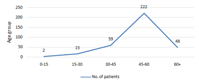 Jawad K et al.26 studded 235 Typhoid patients in which the frequency distribution of typhoid fever cases per age groups of patients ranged from less than first year to sixteen years old, the age-group(>12-14 years old)of patient shows the highest frequency (24.2%)with typhoid fever ed. In the current study the age group 45-60 shows the highest frequency 222 (64.16%). According to Rahman AKMM et al.27out of 84, prevalence of Typhoid fever was highest 54 (56.25%) among the school age (5-10year) patients followed by adolescents. But in the present study total was 336 Typhoid patients in which the prevalence was highest 222 (64.16%) in young peoples, the age group of 45-60. The finding of Rahman AKMM et al. 27 is not in correlation. This may be since in this area the working age group 4560 who are exposed to infection early in the community. During the study work, 2552 people visited the DKSM. Hospital Matta for the diagnosis of typhoid. Among these, only 346 (13.56%) patients were diagnosed positive for typhoid. The patients were divided into different age groups based on their ages. Out of 346 (13.56%) patients, there were 2 (0.58%) patients in the age group of 0-15year, 15 (4.34%) patients in the age group of 15-30years, 59 (17.05%) patients in the age group of 30-45years, 222(64.16%) patients in the age group of 45-60years, 48(13.88%) patients in the age group of +60years.