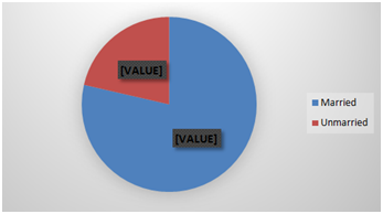 The research work of Anand PK & Ramakrishnan R28 evaluated that the attack rate of disease was 104 cases per 1000 population i.e. 95.45 and 114 cases per 1000 population in male and female respectively. In present study, 46.82% male and 53.18% female were typhoid patients. The percentage of typhoid in female was greater than male. Therefore, the result of current study is in favor with the study of Anand PK & Ramakrishnan R28. In the current work 346 patients were in consideration in which 162 (46.82%) patients were male and 184 (53.18%) patients were female as shown. The results showed high rate of occurrence in female (53.18%) than male (46.82%). Waris et al. [29] studded 97 Typhoid patients. Among the m50 (51%) were married and 47 (48.5%) unmarried. In the present research, the frequency of married patients was higher than unmarried. So, present research work is in agreement with the work of Waris Qidwai et al. 29 The reason may be that, the overall number of married people sis greater than single. In the analyzed data, 346 patients were positive for Typhoid. These patients were divided into two groups on the basis of their marital status. Of these 272 (78.6%) patients were married and 74 (21.4%) patients were unmarried. It showed that Typhoid was high in married people as compared to unmarried.