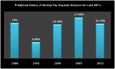 For this argument, I will be comparing registered nurses to registered respiratory therapists at the associate degree level, to exhibit the disparity in pay between the two health care fields. Even though respiratory therapists work alongside medical doctors and registered nurses with bachelors and master’s degrees in all critical care areas in the hospital. Also, I will display the disparity in pay between respiratory therapists throughout the nation between private and public sectors. The reason I selected the nursing department and not any of the other ancillary or allied health departments is because the only other health care professional other than a nurse that has as much patient bedside contact on a daily basis is the respiratory therapist. I will be providing data on the pay disparity over time between nurses and respiratory therapists. This information will demonstrate the reason why there is a lot of frustration in the respiratory therapy community. If appropriate compensation, along with proper utilization of the respiratory therapist were to happen, thus more qualified candidates would apply for respiratory therapy programs, resulting in an improved pool of well qualified therapists available for the health care community nationwide. The disparity in pay between these two career fields amid the years of 1988-2012 nationwide has varied significantly, between 7% to 17%, as seen on Figure 1 below this data was acquired from the Occupational Outlook Handbooks, indeed.com, Payscale.com, Salary.com and BLS.gov.9-23